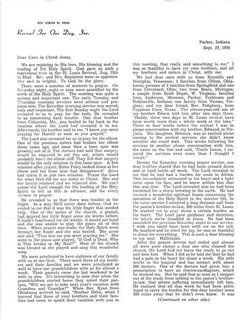 The newsletters contained "mysteries of God" (1 Cor. 4:1) revealed to Bro. Helm for the appointed hour. In response after response, the readers would often comment how healing, help, deliverance would come simply by reading the words on the page.