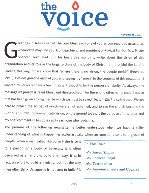 Found Ministries began sending newsletters to supporters of the ministry (under the name of Revival for Our Day) not long after the organization was formed. Most often, Rev. Helm would share profound insight coupled with review from how the Lord was working in his personal life, or in corporate meetings for which the Holy Spirit had led.